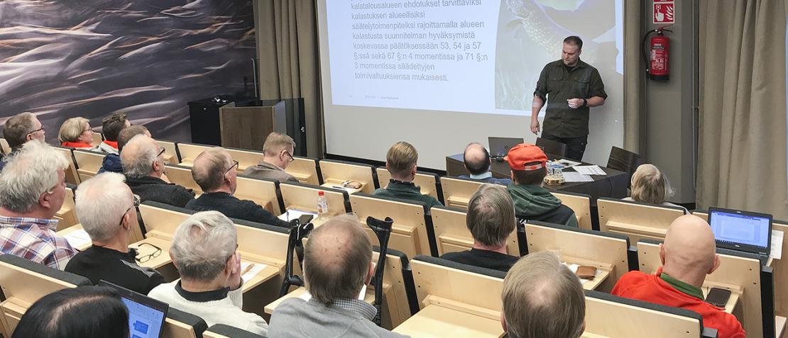 Kalatalouspäivien yhtenä kantavana teemana oli tällä kertaa kalatalousalueiden käyttö- ja hoitosuunnitelmat. Kainuun ely-keskuksen kalatalousasiantuntija Janne Narkiniemi avasi sitä prosessia, jota käyttö- ja hoitosuunnitelmien kanssa käydään läpi, kun kalatalousalueet ovat vahvistaneet KHS:t yleiskokouksissaan ja lähettäneet ne ely-keskukselle.