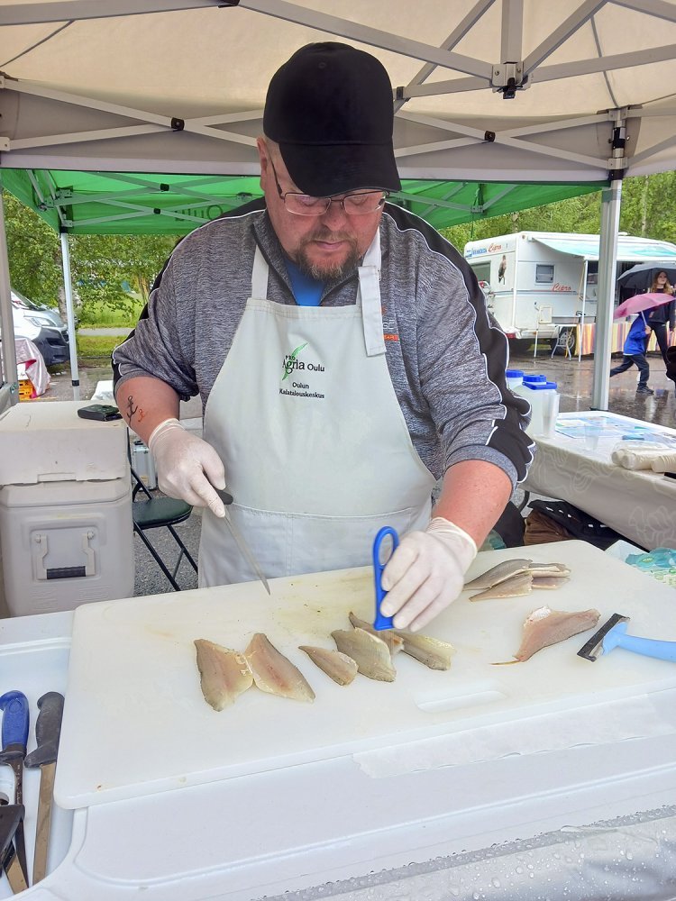 Fileeratut ahvenet päätyivät Oulun Maa- ja kotitalousnaisten ruoka-asiantuntijan Topi Kumpulaisen paistinpannulle. Kumpulainen paistoi ahvenet suoraan markkinakävijöiden maisteltaviksi. Kalaherkku upposikin helposti kaikenikäisten suihin.